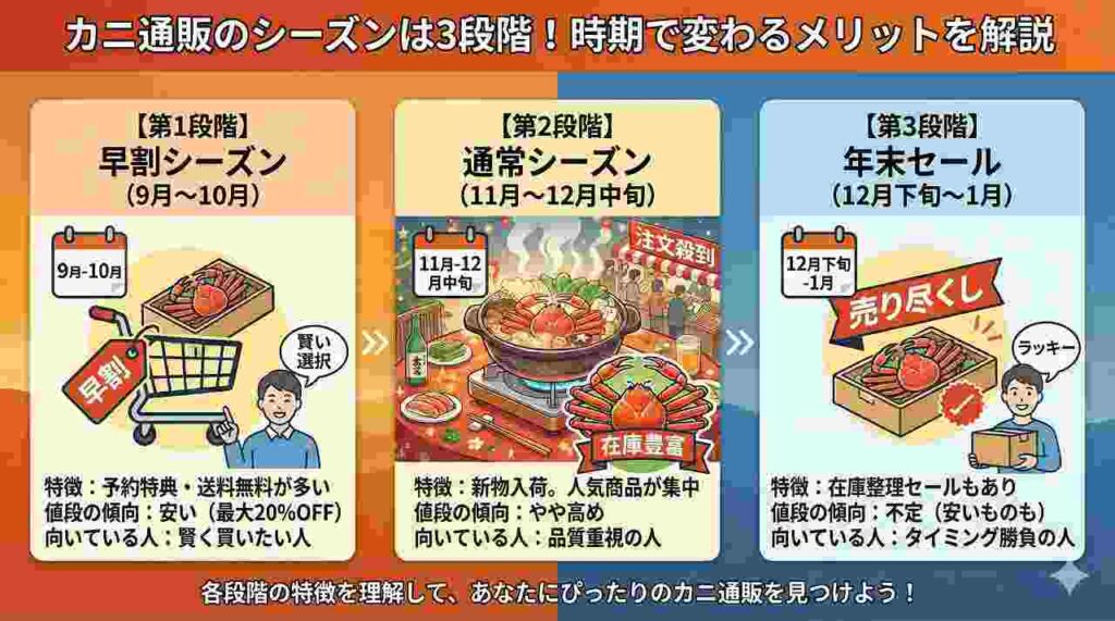 カニ通販の「買いどき」は大きく3つの時期に分かれます👇