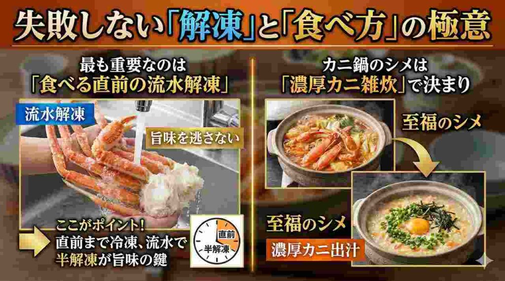 良いカニを買っても、解凍で失敗したら全てが台無しです。ここではプロ直伝のテクニックを伝授します。