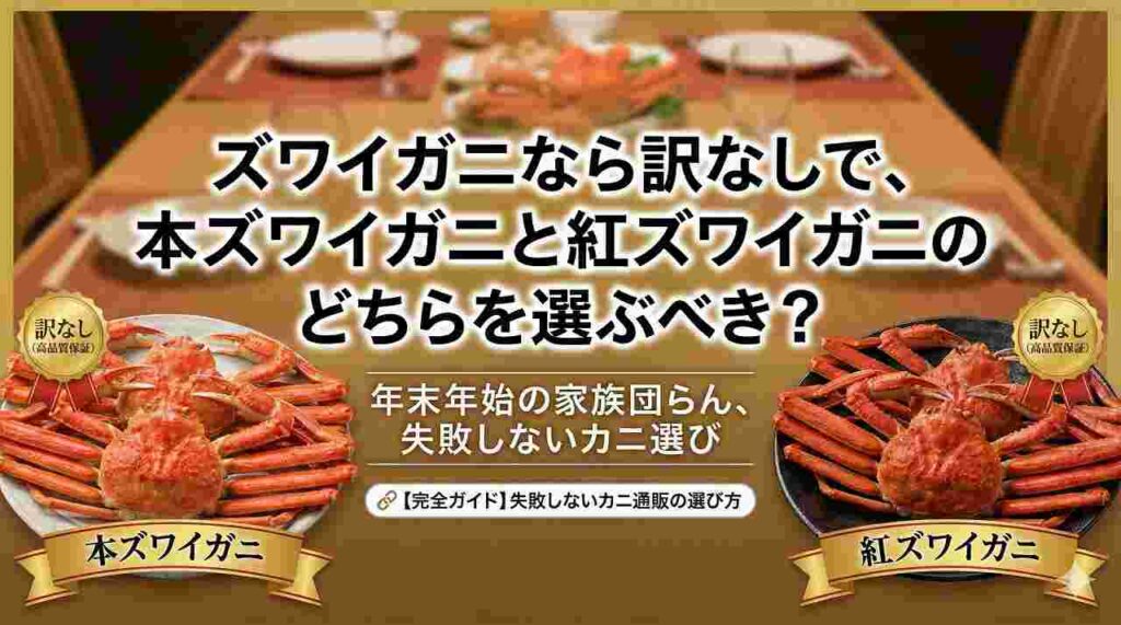 年末の家族団らんで「カニ選び」に失敗したくない50代のご夫婦へ。なぜ今「ズワイガニ 訳なし」を選ぶべきなのか、その理由を業界の裏側から徹底解説します。本ズワイと紅ズワイの決定的な違い、適正価格の算出ロジック、プロが実践する「ドリップを出さない解凍法」、そして絶対に外さない「品質保証」のしっかりした認定店まで。この記事さえ読めば、通販のカニに関する全ての疑問と不安が解消されます。